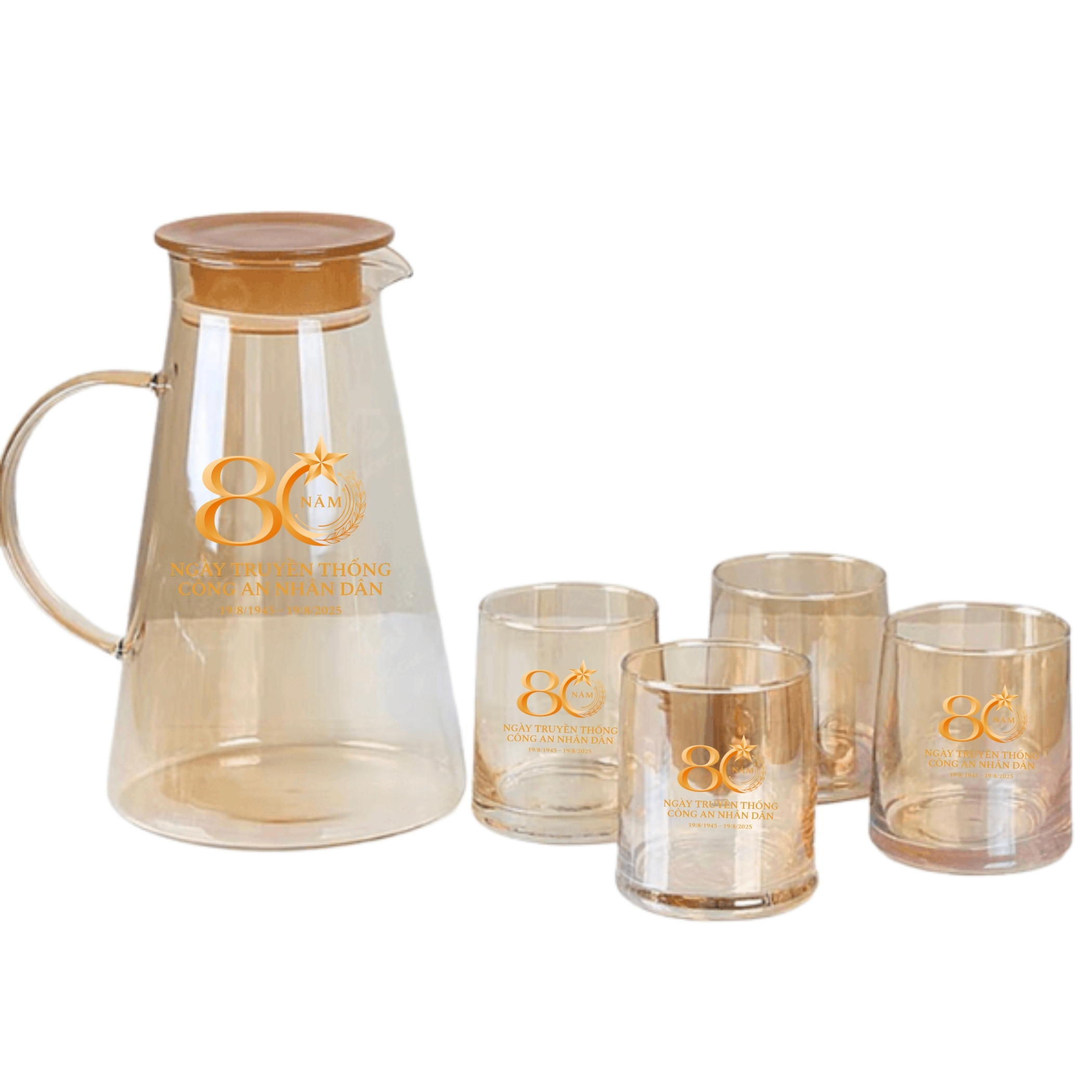 Bộ bình cốc thủy tinh được làm từ thủy tinh cao cấp, an toàn cho sức khỏe, với độ trong suốt cao và thiết kế tinh tế. Bộ sản phẩm gồm bình đựng nước (khoảng 1-1.5 lít) và 4-6 cốc, được in logo kỷ niệm 80 năm Công an Nhân dân bằng công nghệ in hiện đại, đảm bảo hình ảnh sắc nét, bền màu theo thời gian. Thiết kế thường mang các chi tiết biểu tượng như huy hiệu Công an, khẩu hiệu “Vì an ninh Tổ quốc,” hoặc mốc thời gian 1945-2025, tạo điểm nhấn trang trọng.