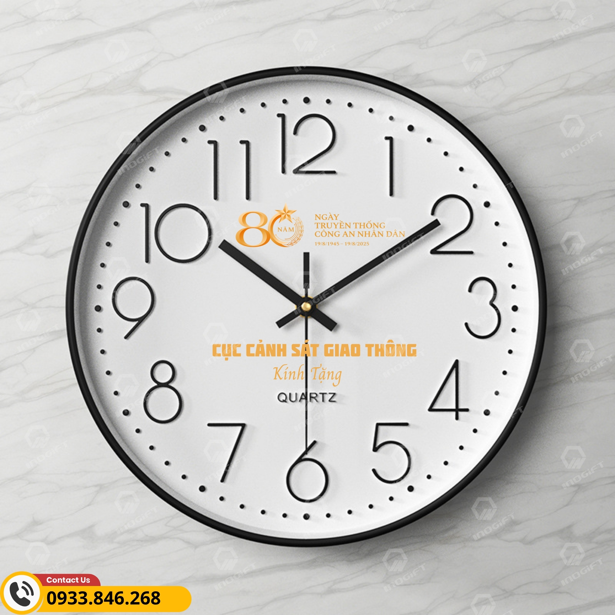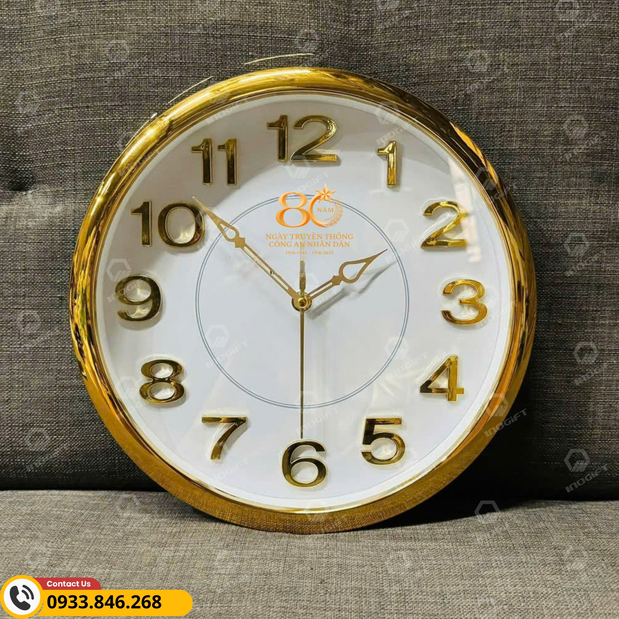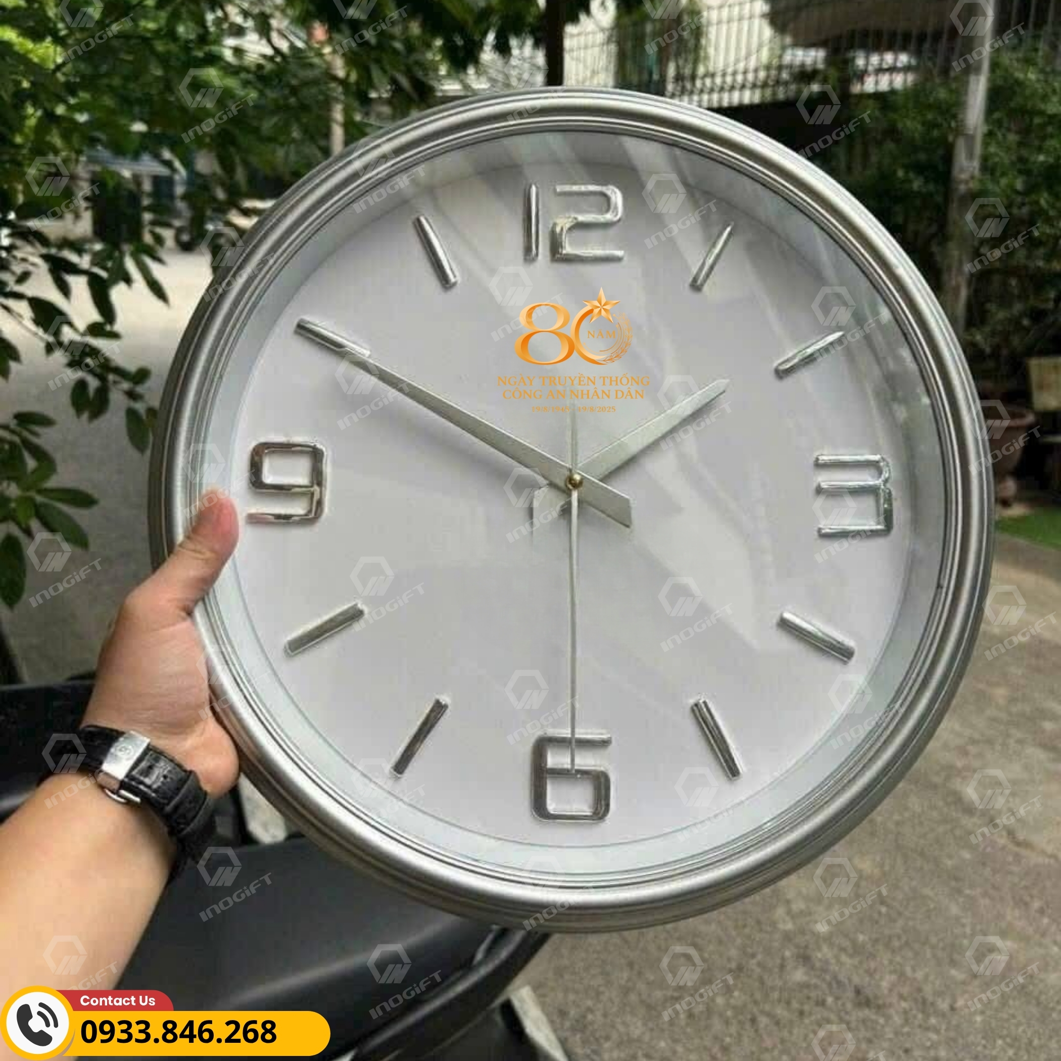 Đồng hồ treo tường được thiết kế với kiểu dáng hiện đại hoặc cổ điển, sử dụng chất liệu như gỗ cao cấp, nhựa ABS bền chắc, hoặc kim loại không gỉ, phù hợp với không gian văn phòng, phòng truyền thống, hoặc gia đình. Mặt đồng hồ in logo kỷ niệm 80 năm Công an Nhân dân, kết hợp các chi tiết như huy hiệu ngành, bản đồ Việt Nam, hoặc mốc thời gian 1945-2025, được in ấn sắc nét bằng công nghệ hiện đại. Đồng hồ hoạt động bằng pin, đảm bảo độ chính xác cao, với kích thước khoảng 30-32cm, dễ dàng treo ở nhiều không gian.