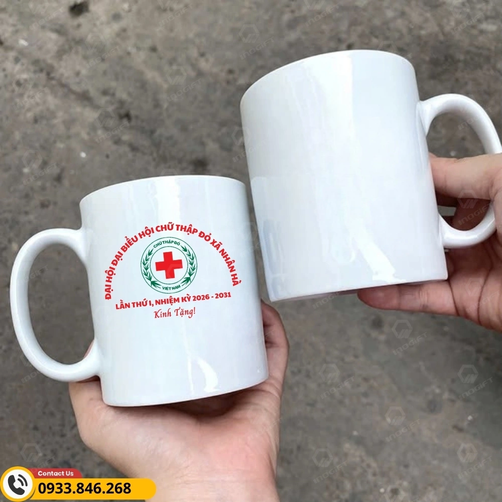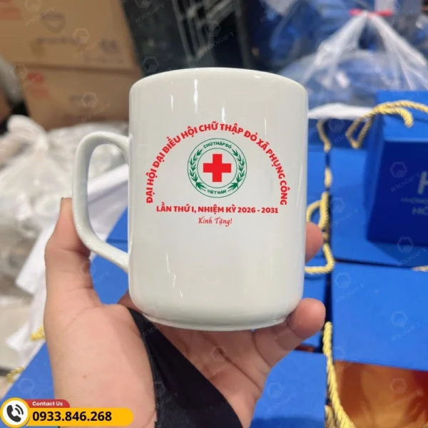 Ly sứ in logo quà tặng Đại hội Chữ Thập Đỏ là món quà nhỏ gọn nhưng mang chiều sâu ý nghĩa. Chiếc ly gắn liền với những sinh hoạt thường ngày như uống nước, trà hay cà phê, vì vậy logo Chữ Thập Đỏ được in trên bề mặt sứ trở thành điểm chạm tinh tế, nhắc nhớ liên tục về tinh thần nhân đạo, sẻ chia và trách nhiệm với cộng đồng. Sự hiện diện bền bỉ ấy giúp thông điệp của Đại hội lan tỏa tự nhiên, không phô trương mà rất bền lâu.