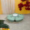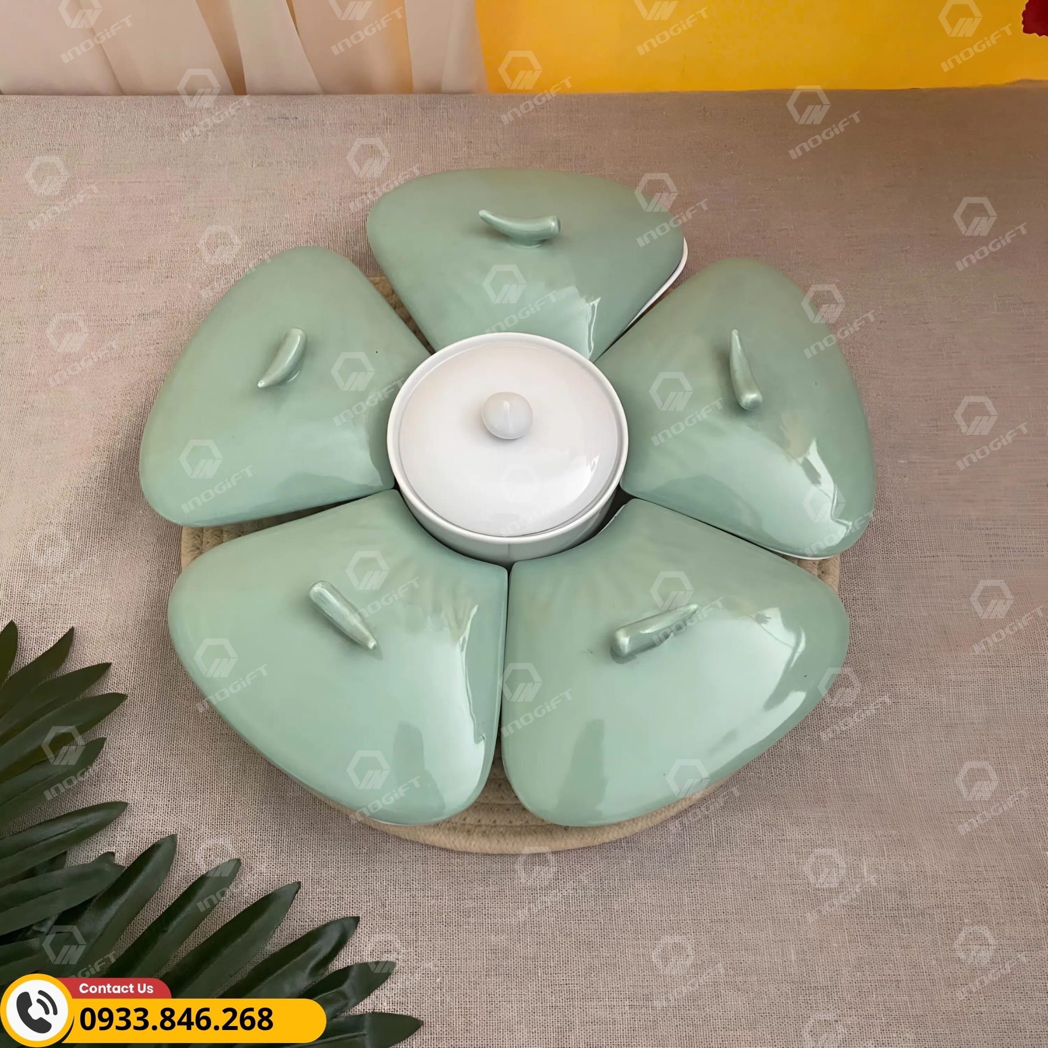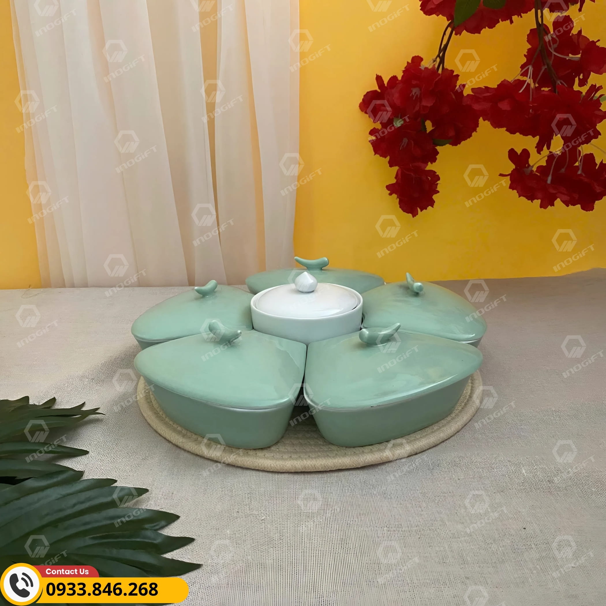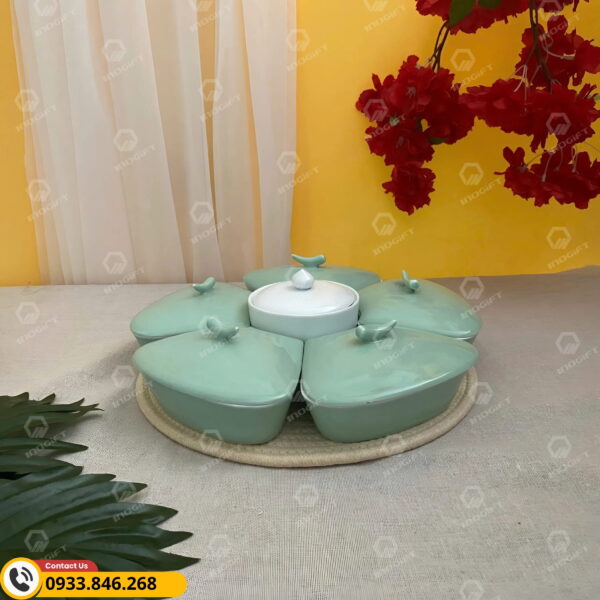 Chất liệu chính là gốm sứ Bát Tràng với lớp men màu xanh ngọc/xanh mint nhẹ nhàng, hiện đại, mang lại cảm giác tươi mới và sạch sẽ. Mỗi cánh sứ đều có nắp đậy riêng biệt và tay cầm nhỏ xinh, giúp bảo quản mứt, bánh kẹo, hạt dưa khỏi ẩm mốc và bụi bẩn, giữ được hương vị thơm ngon lâu dài.