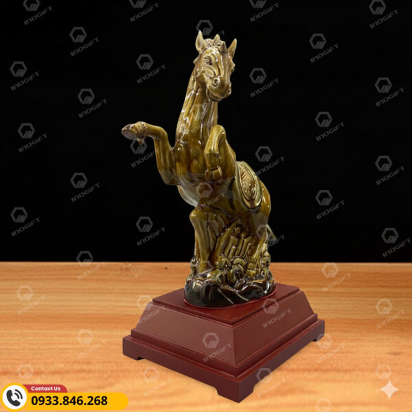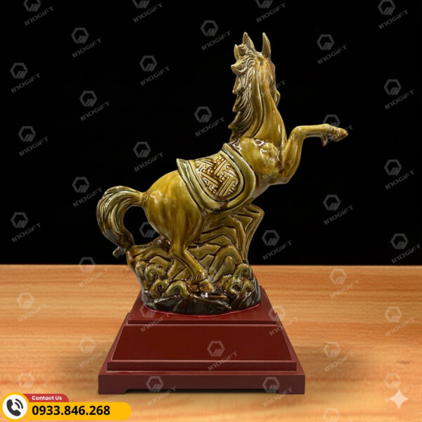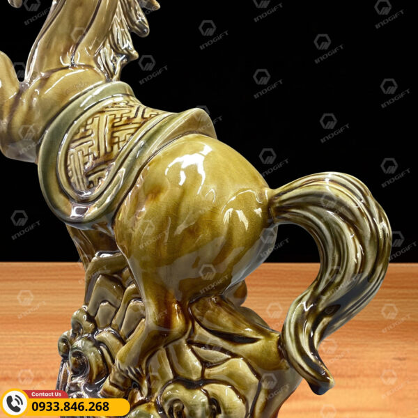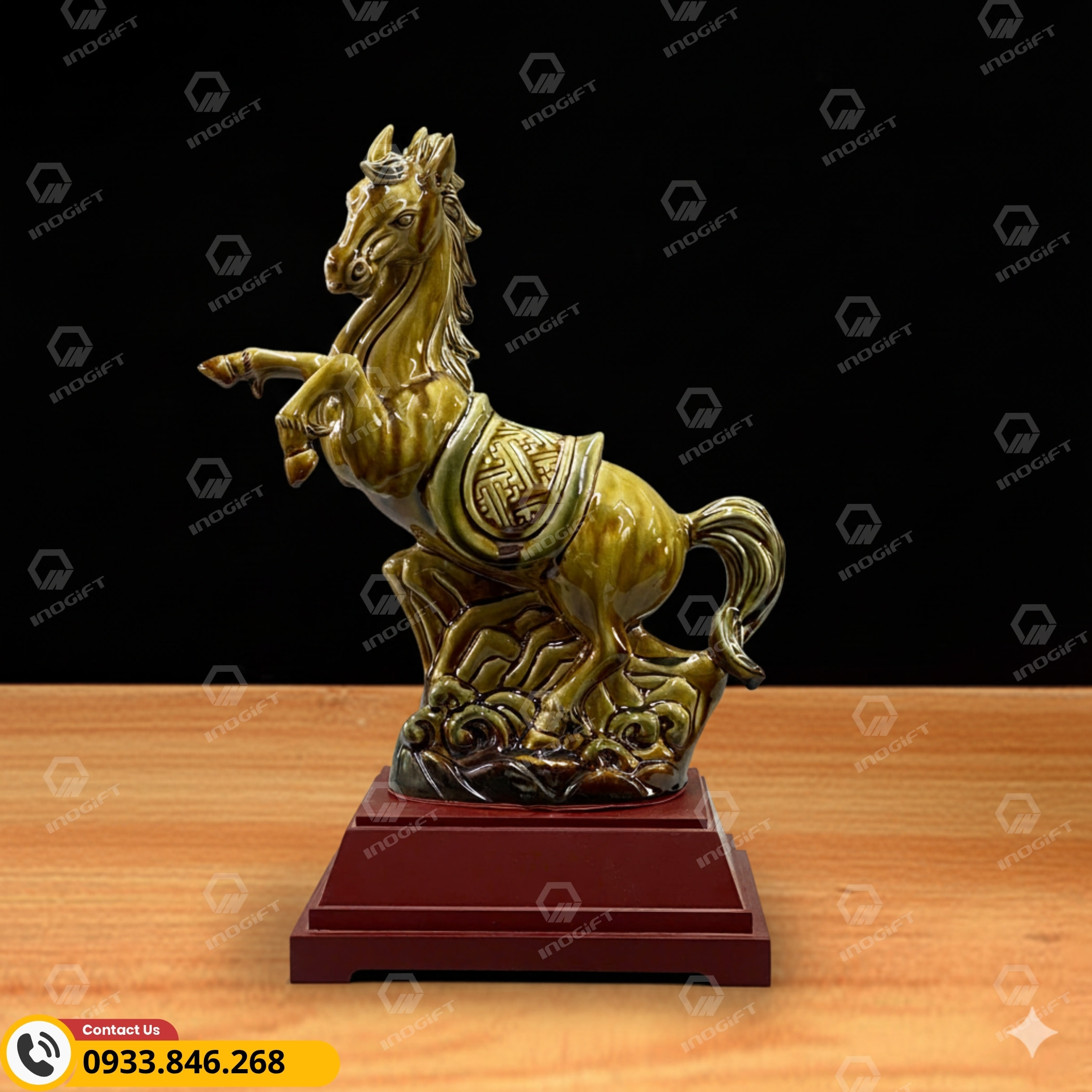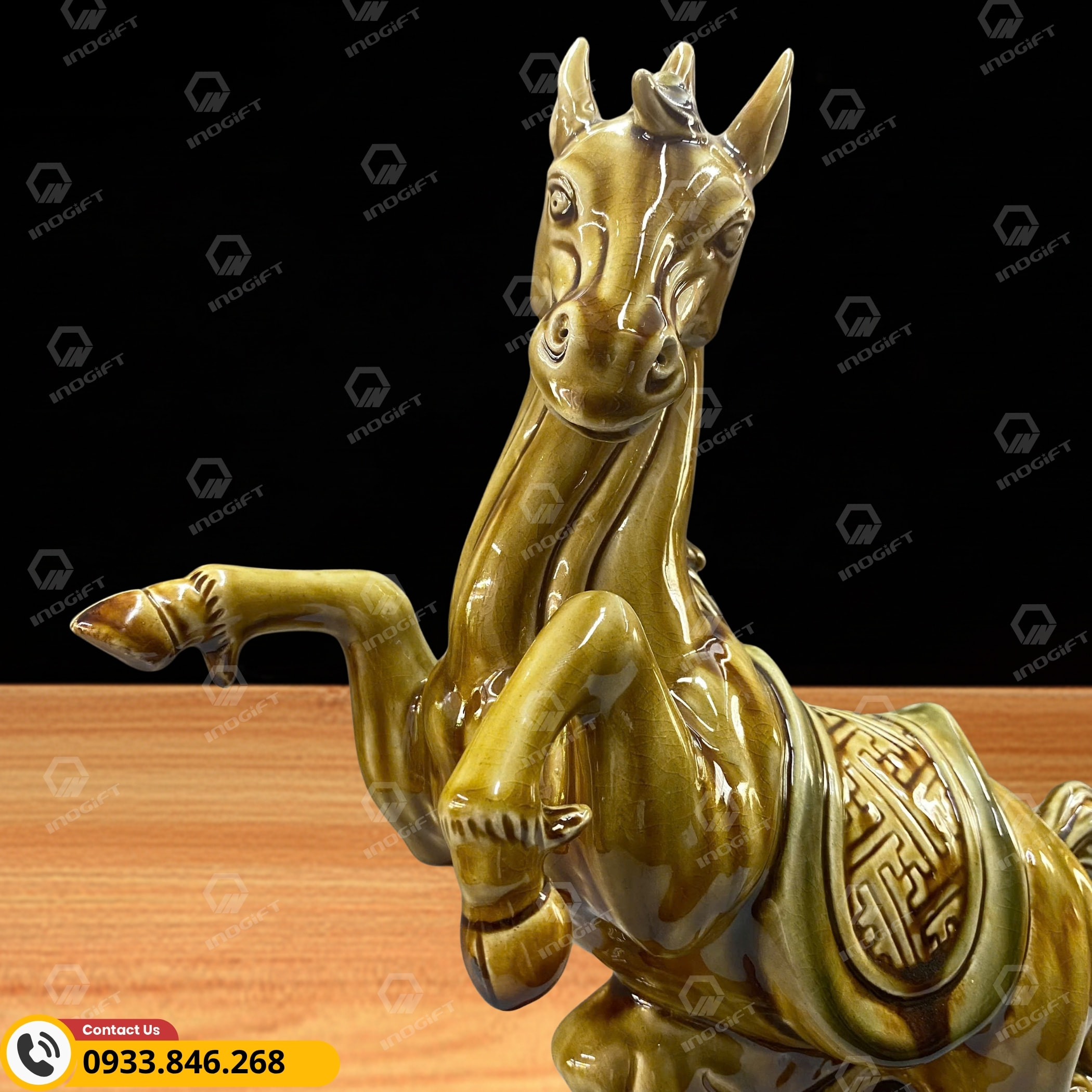 Tượng ngựa gốm Bát Tràng là món quà Tết và quà tặng doanh nghiệp tinh tế, thể hiện sự sang trọng và ý nghĩa phong thủy sâu sắc. Sản phẩm được chế tác tỉ mỉ, men hoàng thô óng ánh, tôn lên vẻ uyển chuyển, mạnh mẽ của chú ngựa đang phi nước đại trên mây, mang đến cảm giác dồi dào năng lượng và khát vọng vươn tới thành công.