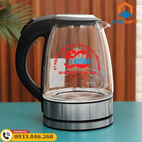 Ấm siêu tốc là món quà tặng hữu ích, phù hợp làm quà tặng 30/4 cho doanh nghiệp. Với thiết kế nhỏ gọn, tiện lợi, sản phẩm giúp đun nước nhanh chóng, tiết kiệm thời gian, đáp ứng nhu cầu sử dụng trong gia đình, văn phòng hay ký túc xá. Sản phẩm được làm từ chất liệu inox hoặc nhựa cao cấp, đảm bảo độ bền, an toàn khi sử dụng. Thiết kế hiện đại, tay cầm chắc chắn, dung tích đa dạng giúp phù hợp với nhiều đối tượng sử dụng. Đặc biệt, ấm siêu tốc có thể in logo kỷ niệm 50 năm ngày giải phóng miền Nam, tạo dấu ấn ý nghĩa cho sự kiện trọng đại này.